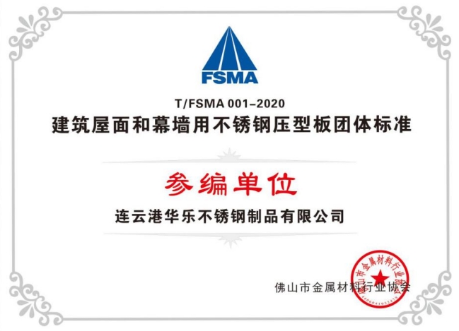 荣誉资质:建筑屋面和幕墙用不锈钢压型板团体标准